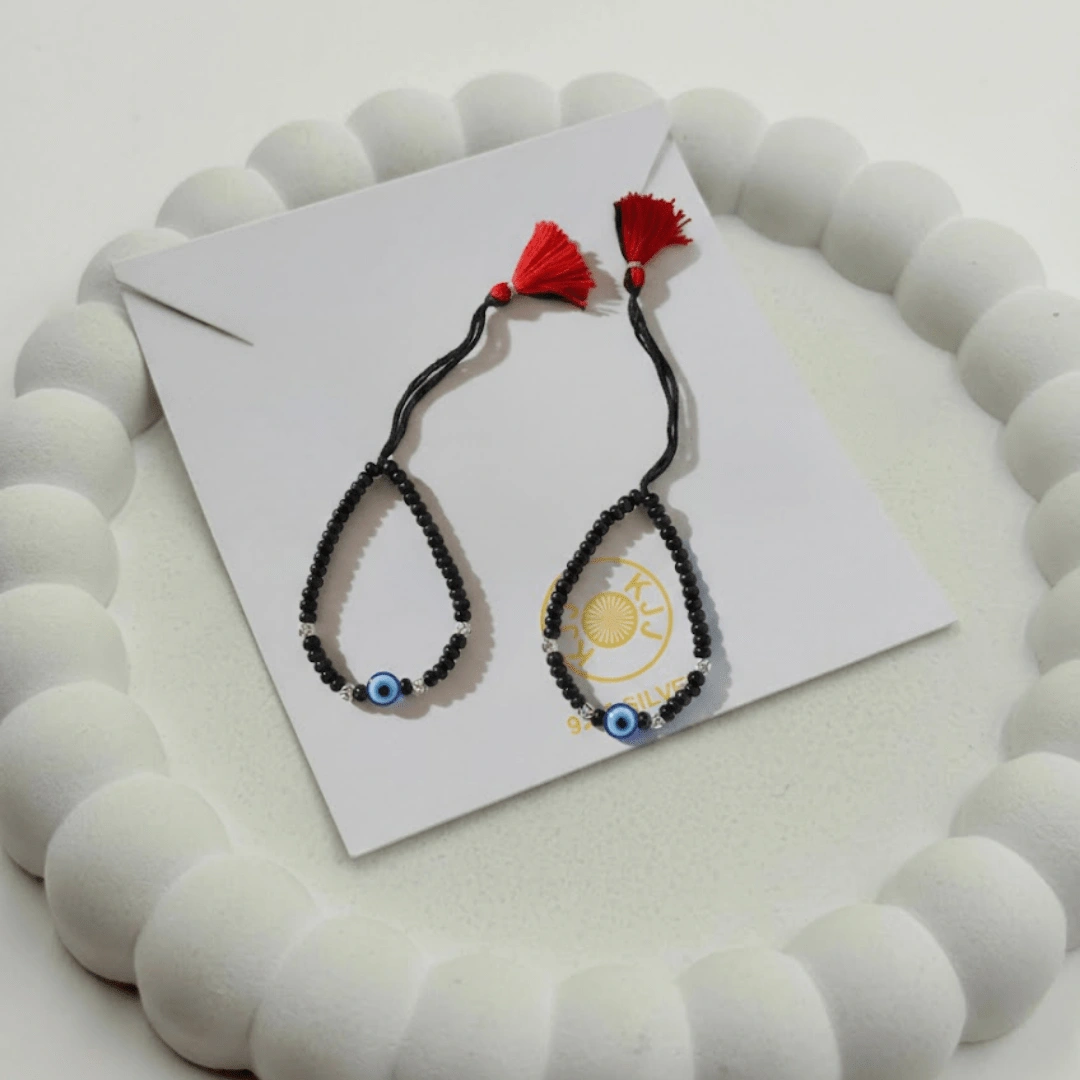 Surround your baby with a shield of love and ancient tradition with the KJJ Elite Baby Nazariya. This premium protective set features a vibrant central blue evil eye charm, beautifully accented by 2.5mm imported silver balls with an exquisite chevron (V-cut) texture. The multi-faceted patterns on the silver beads are designed to catch and reflect light, providing a sophisticated radiance that honors the sacred “Kala Dhaga” tradition.