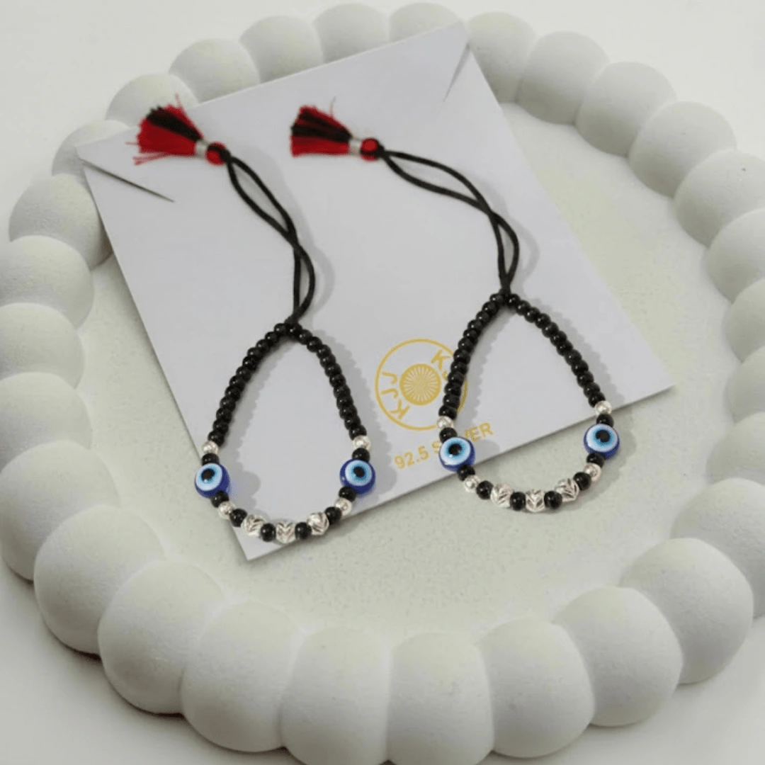 Handcrafted with certified 92.5 Sterling Silver, these bracelets are meticulously hand-strung on a soft, durable black cord with polished black beads to ward off negative energy. Designed specifically for sensitive infant skin, this set ensures your little one remains shielded and stylish from their very first days.