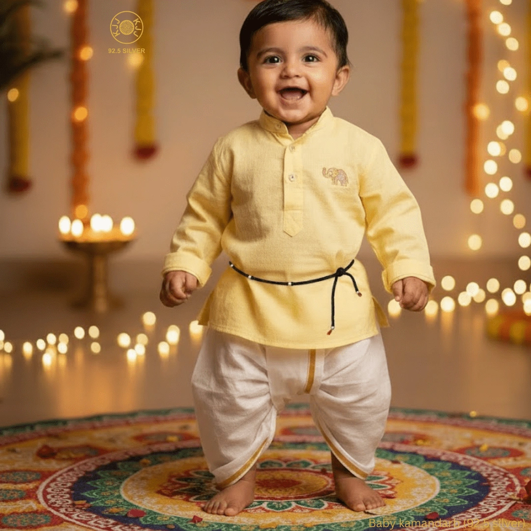 Adorn your little one with the KJJ Essential Baby Kamarband, a piece that beautifully balances minimalist design with sacred tradition. This waist chain is handcrafted for daily wear, featuring delicate 92.5 Sterling Silver accents interspersed along a durable, skin-friendly black thread.