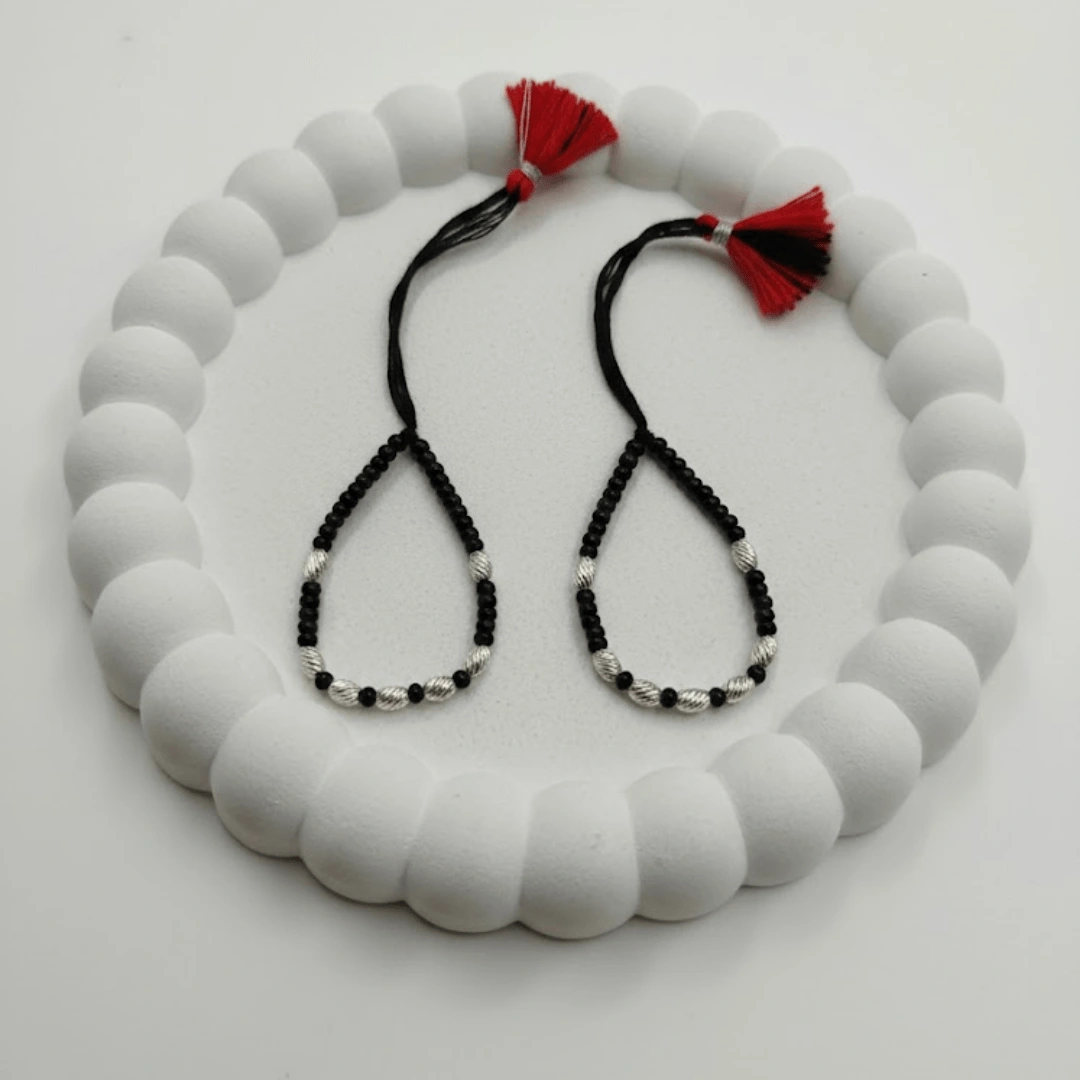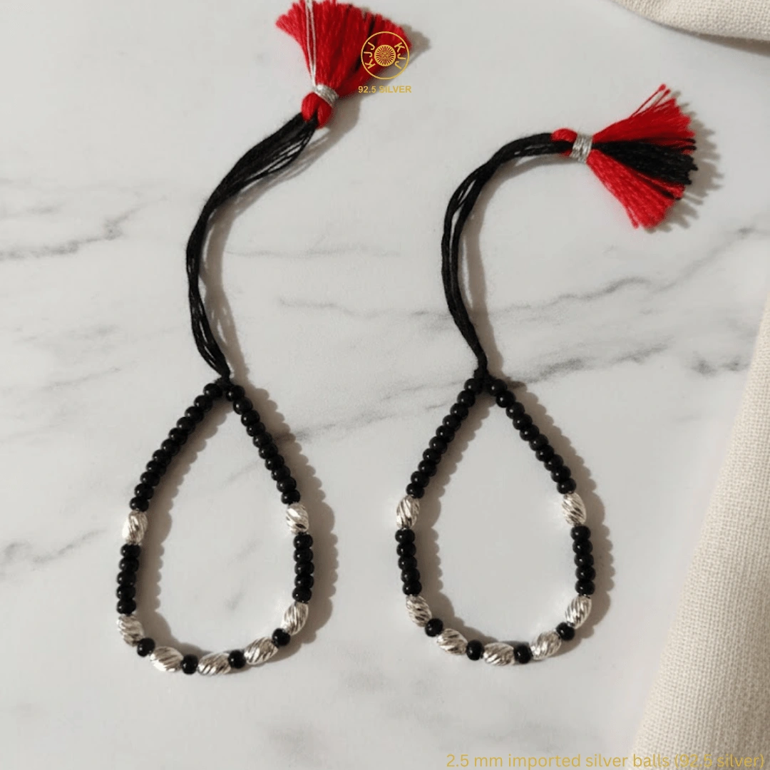 Handcrafted with certified 92.5 Sterling Silver, these bracelets feature a dense sequence of silver and polished black beads, hand-strung on a soft, durable black cord. Designed specifically for sensitive infant skin, this high-density design offers a bold, luminous look while maintaining the spiritual power of a traditional “Nazar Battu” to ward off negative energy.