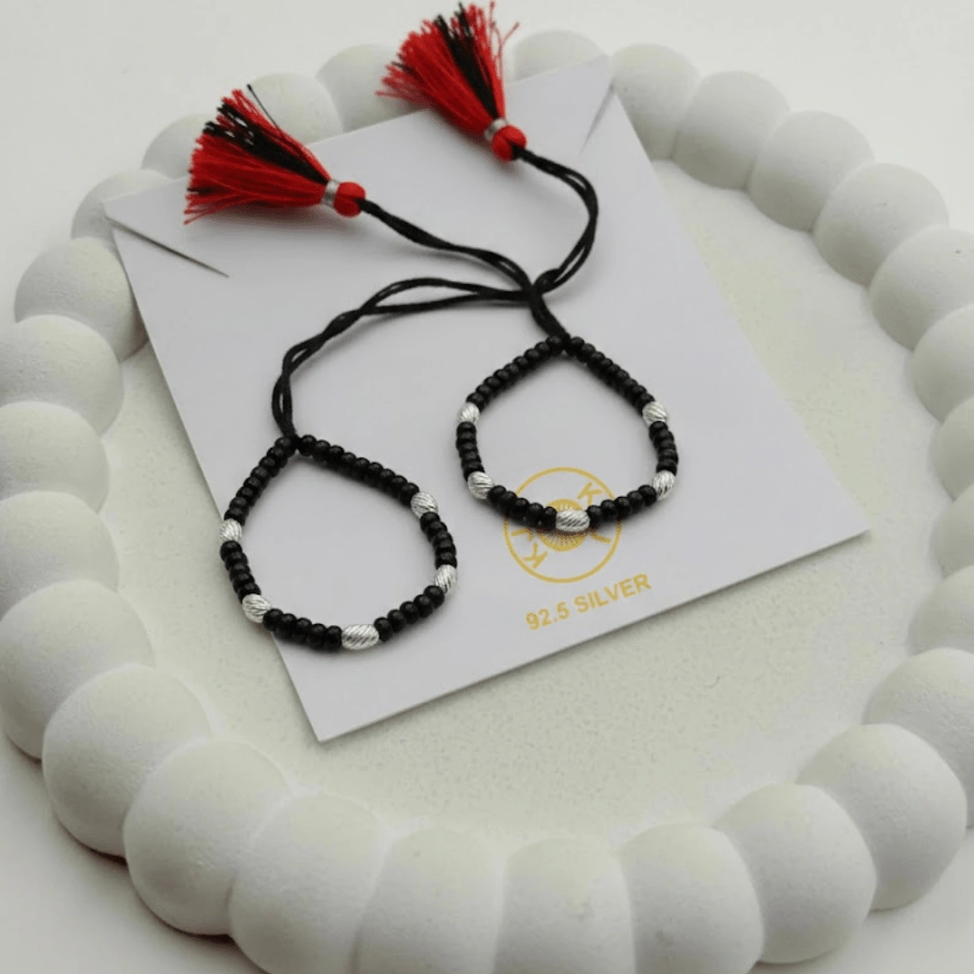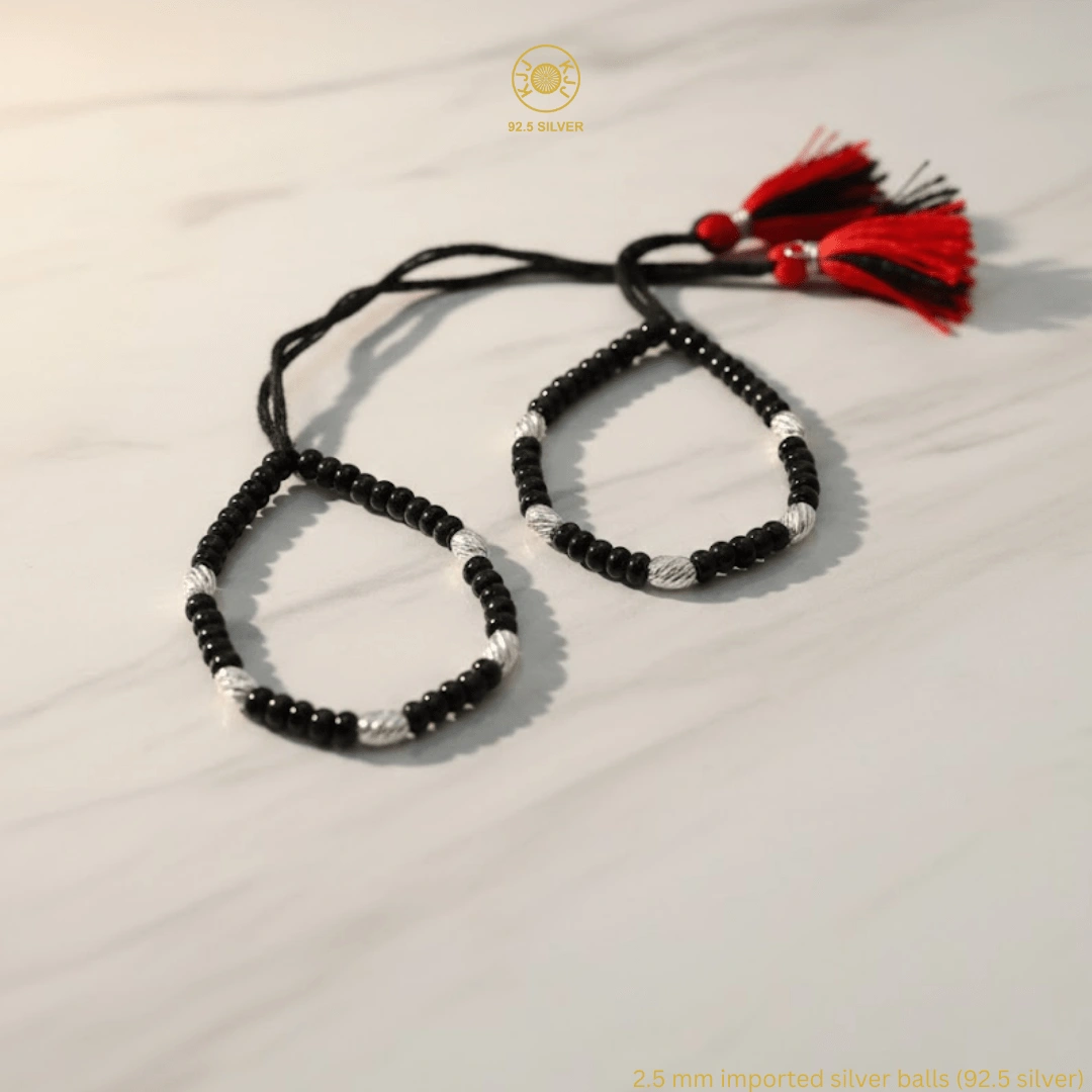 Handcrafted with certified 92.5 Sterling Silver, these bracelets feature a dense sequence of silver and polished black beads, hand-strung on a soft, durable cord. Designed specifically for sensitive infant skin, this high-density design offers a bold, luminous look while maintaining the spiritual power of a traditional “Nazar Battu”.