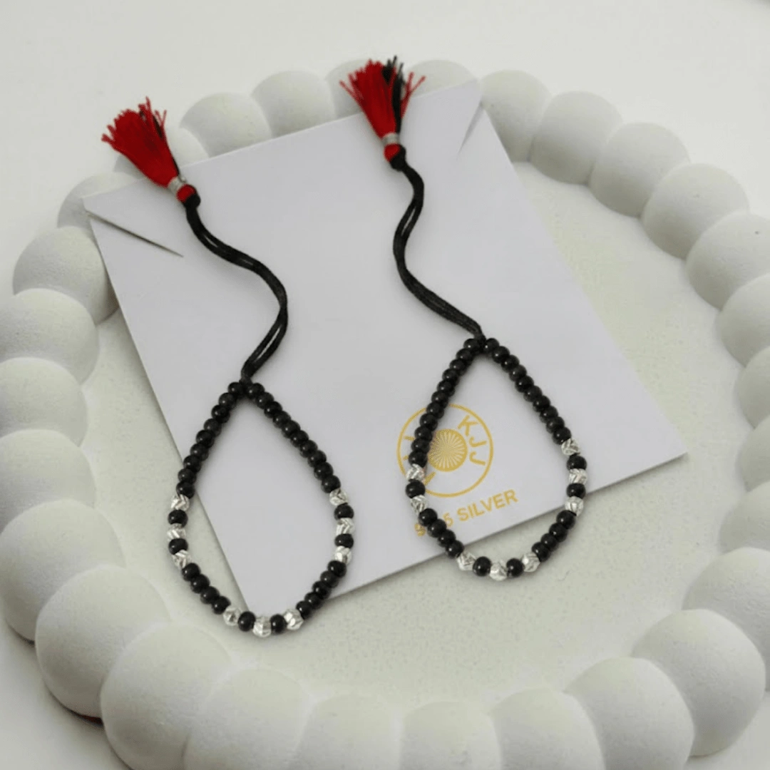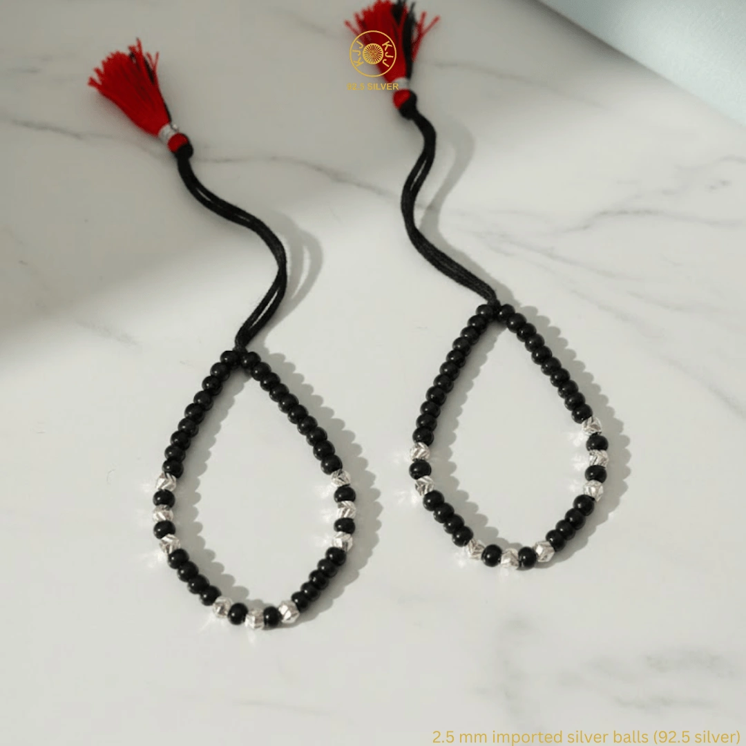 Handcrafted with certified 92.5 Sterling Silver, these bracelets feature a dense sequence of silver and polished black beads, hand-strung on a soft, durable cord. Designed specifically for sensitive infant skin, this high-density design offers a bold, luminous look that maintains the spiritual power of a traditional “Nazar Battu”.