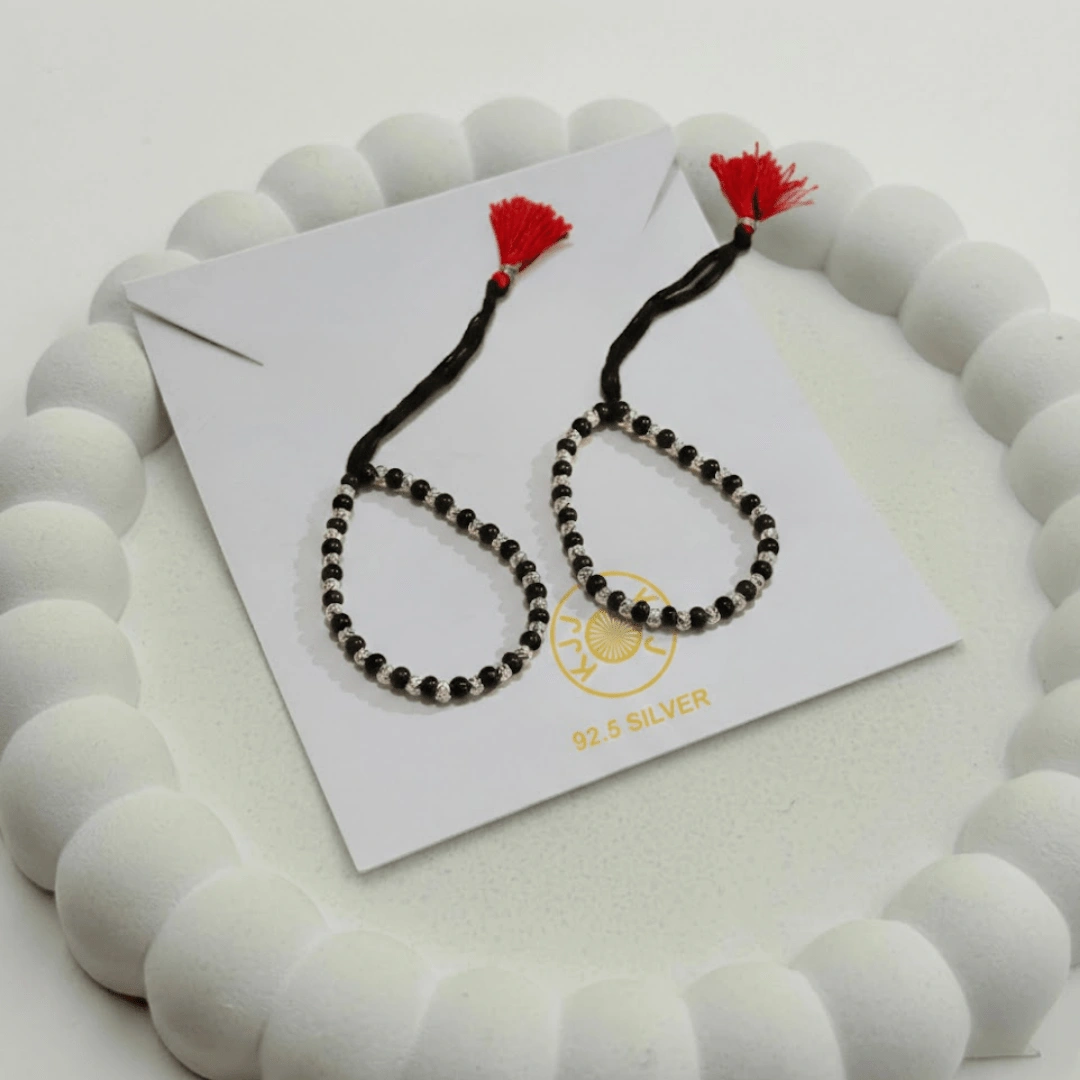 Elevate the traditional “Kala Dhaga” with the KJJ Signature High-Density Nazariya. This premium set features an increased concentration of 2.5mm imported silver balls, each meticulously engraved with an exquisite chevron (V-cut) texture. The dense arrangement of these multi-faceted silver beads creates a continuous stream of brilliance that catches the light with every tiny movement, providing a more “silver-forward” look for your infant.