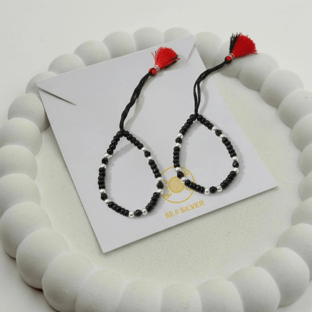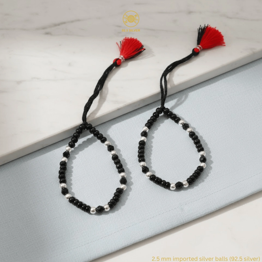 KJJ Signature 92.5 Sterling Silver Baby Nazariya – Handcrafted High-Density 2.5mm Imported Silver Ball & Faceted Black Crystal Protective Bracelets (Set of 2)