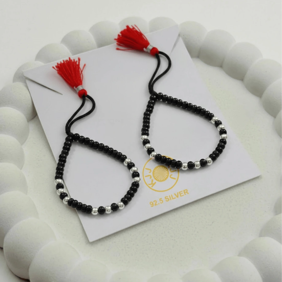 Handcrafted with certified 92.5 Sterling Silver, these bracelets feature a sequence of silver and polished black beads on a soft, durable cord designed to ward off negative energy. This high-density design is the ideal choice for parents seeking a “silver-forward” look that combines the spiritual power of a “Nazar Battu” with the elegance of a fine heirloom piece.