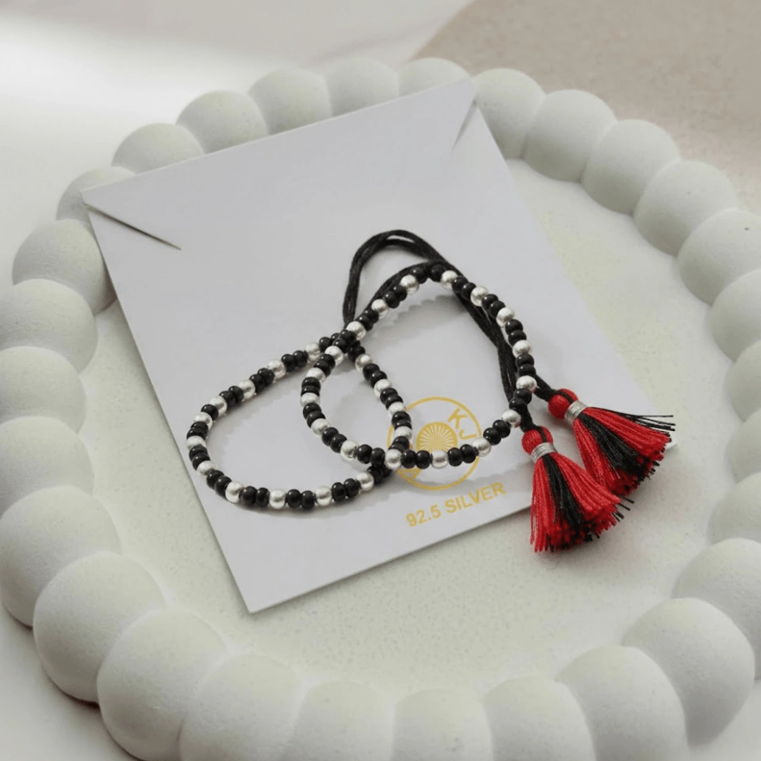 Experience the perfect harmony of luxury and ancient tradition with the KJJ Signature High-Density Nazariya. This premium protective set is defined by its rich arrangement of 2.5mm imported silver balls, meticulously hand-strung to provide a sophisticated, mirror-like shine. The dense placement of these high-purity silver beads creates a continuous, radiant shimmer that honors the classic “Kala Dhaga” while offering a modern, luxury aesthetic for your baby’s wrist.