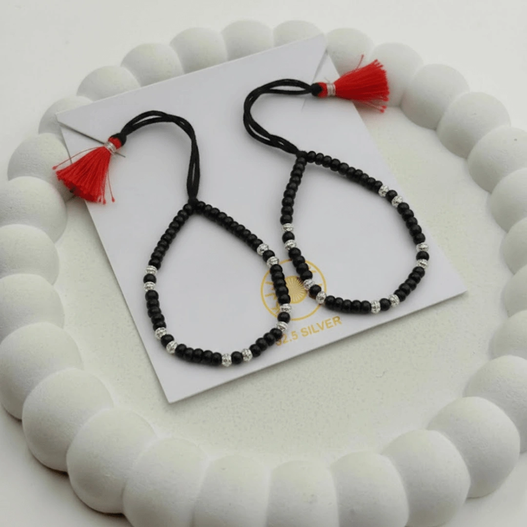 Handcrafted with certified 92.5 Sterling Silver, these bracelets feature a sequence of silver and polished black beads on a soft, durable cord designed to ward off negative energy. This high-density design is the ideal choice for parents seeking a “silver-forward” look that combines the spiritual power of a “Nazar Battu” with the elegance of a fine heirloom piece.